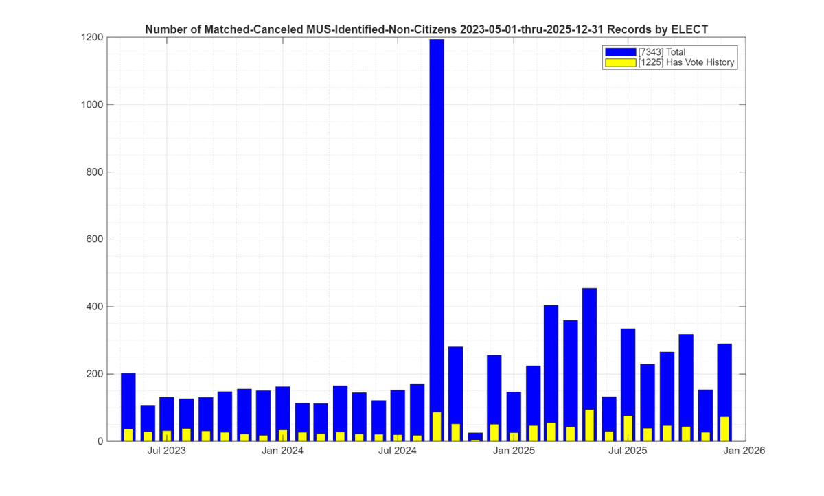 It appears from the MUS data, that the VA Department of Elections (ELECT) is doing routine identification, cleanup and removal of non-citizen registrations, which is a good thing and we commend them for their continued efforts to maintain clean voter registration lists.