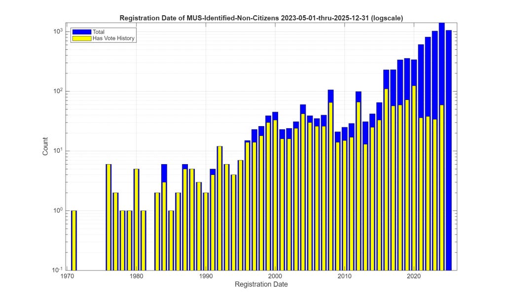 Additionally, this evidence which is derived from only official state records, directly contradicts multiple news media reports and attestations that non-citizen voting is a “Myth”, and that non-citizen voting happens “almost never”. If the data from ELECT is accurate, then there are at least 3,515 ballots that have been cast by non-citizen voters just since 2019. Now, that is still very infrequent, but it is not “almost never.” It is a legitimate concern … and these discoveries are only the registrations that have been found and removed from the voter roles by ELECT and that we can observe in the data. We do not know how many exist that we do not know about.