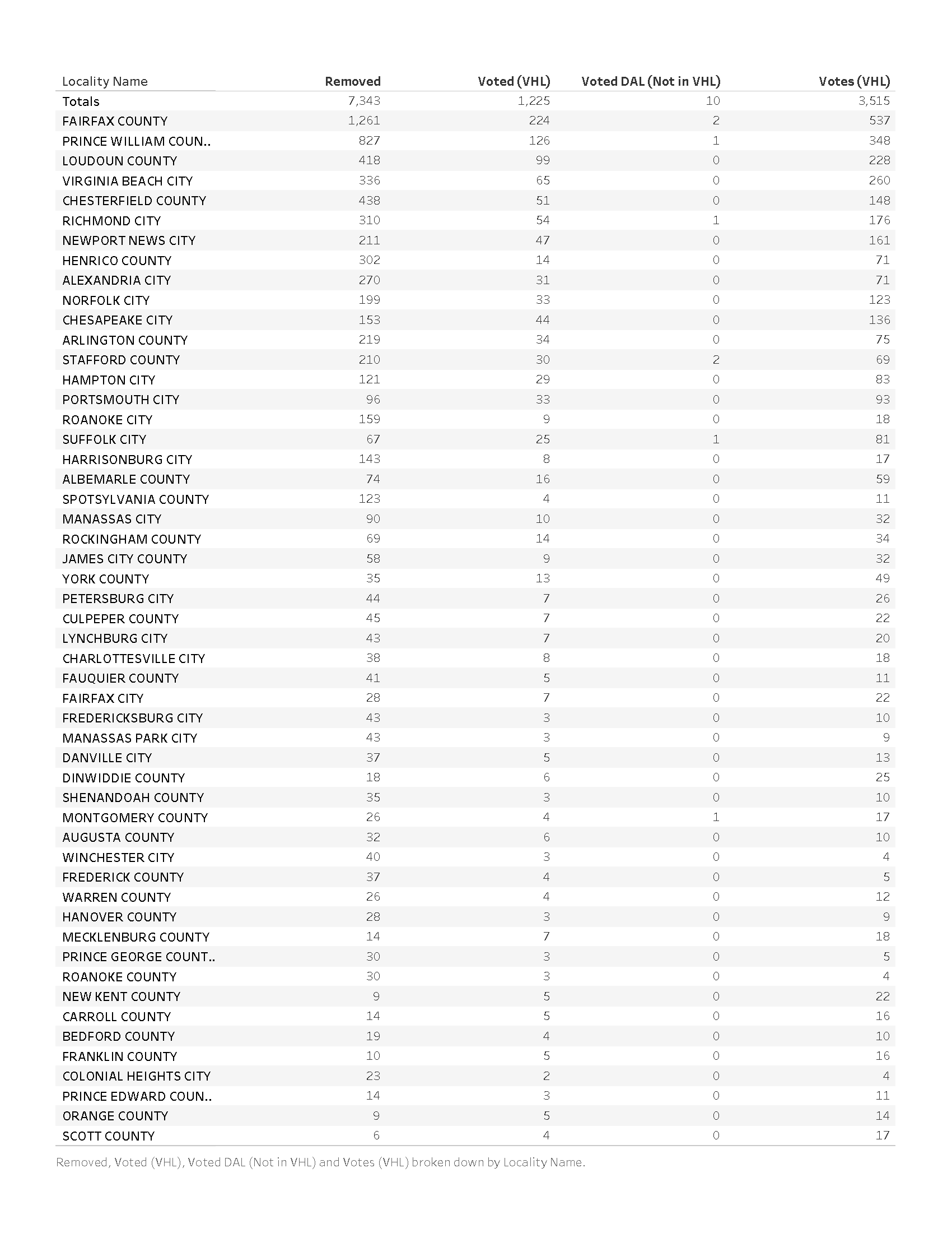 The distribution of identified unique voter ID’s for the 1,225 identified non-citizen voters per VA locality is given below in Table 1. It should be noted that each ballot record has a specific locality associated with where the ballot was cast, whereas unique individuals might move between localities over time. The assignment of unique identified individuals to each locality in table 1 is therefore based on the locality listed in the specific MUS “Declared Non-Citizen” record for that individual, while the assignment of ballot cast to Localities is based on the individual VHL/DAL records. A person could have lived and voted multiple times in one county, then moved to another county and voted again before finally being determined as a non-citizen. The same person would have generated multiple VHL/DAL records for each ballot cast, and associated with potentially different localities. This should be kept in mind when attempting to interpret Table 1.