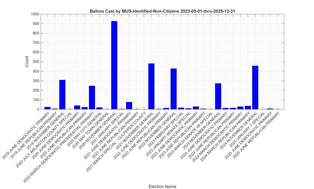 The fact that a small number of these identified non-citizen registrations are also associated with (presumably … if the data from ELECT is accurate) illegally cast ballots in previous elections does raise a number of questions that citizens should be (politely) asking and discussing with their legislators, elected and appointed government officials. Each act of non-citizen voting is a de-facto disenfranchisement of legal voters rights, and is a punishable offense under VA law.