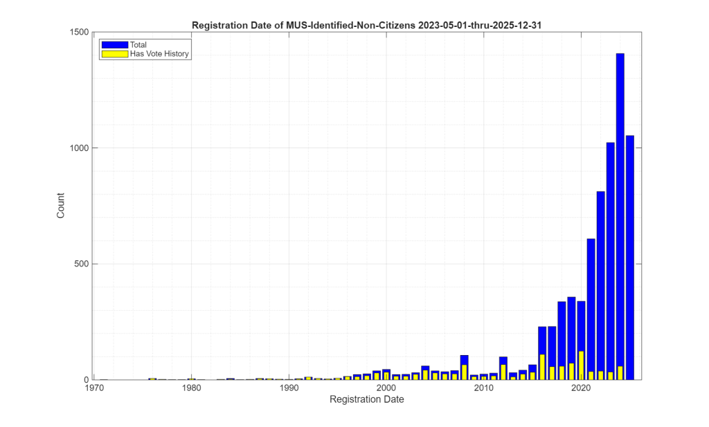 Note that the data contained in the MUS updates often covers more than a single month period. In other words, the individual MUS files are oversampled. Subsequent MUS files can therefore also have repeated entries from previous versions, as their data may overlap. Our analysis used the first unique entry for a given voter ID marked as “Declared Non-Citizen” in the cumulative MUS record, that had not been subsequently reinstated, in order to build Figure 1. This data oversampling in the MUS may help explain the relative spike in the first (May 2023) bin compared to subsequent months.