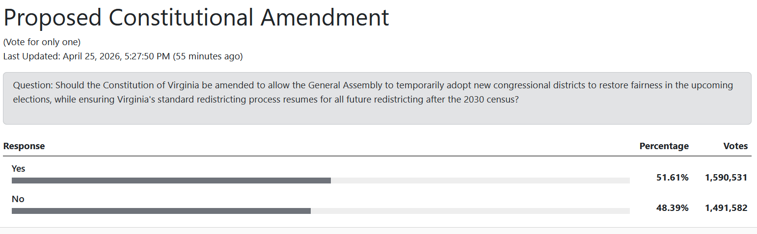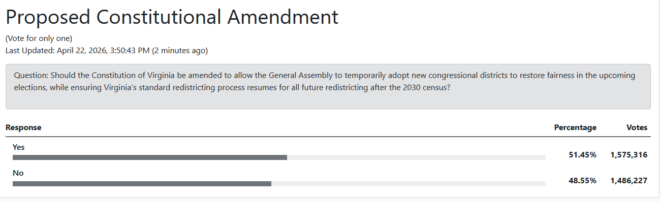 As of Saturday, April 25th, the “yes” votes for whether to allow Assembly Democrats to redraw congressional seats from 6-5 (D-R) to 10-1 (D-R) had increased by a few percentage points to 51.6% of the vote (1.59 million).