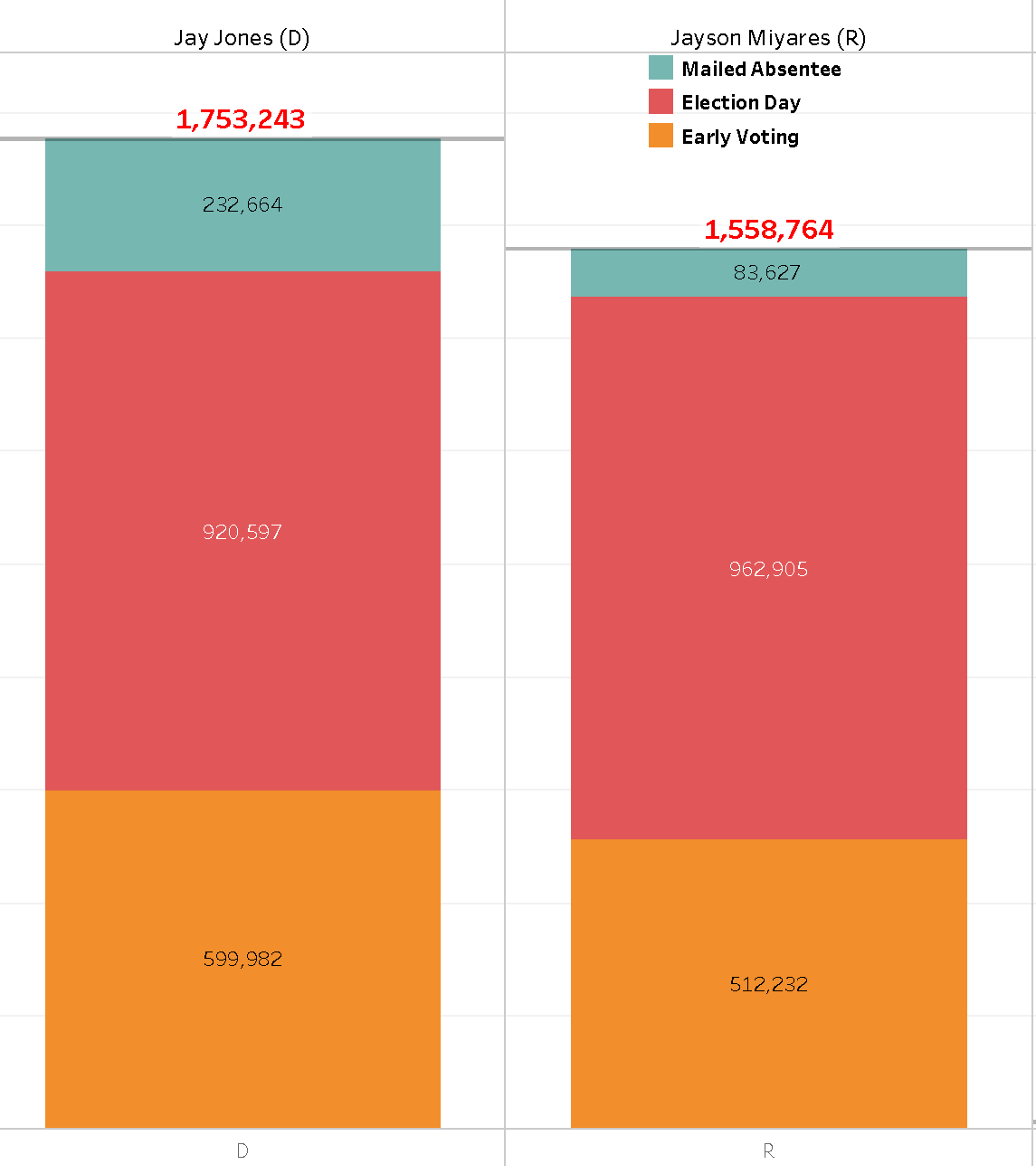 The Attorney General race was much more competitive in the Early Voting and Election Day turnout. But Miyares only won about 35% of the mailed absentee vote.
