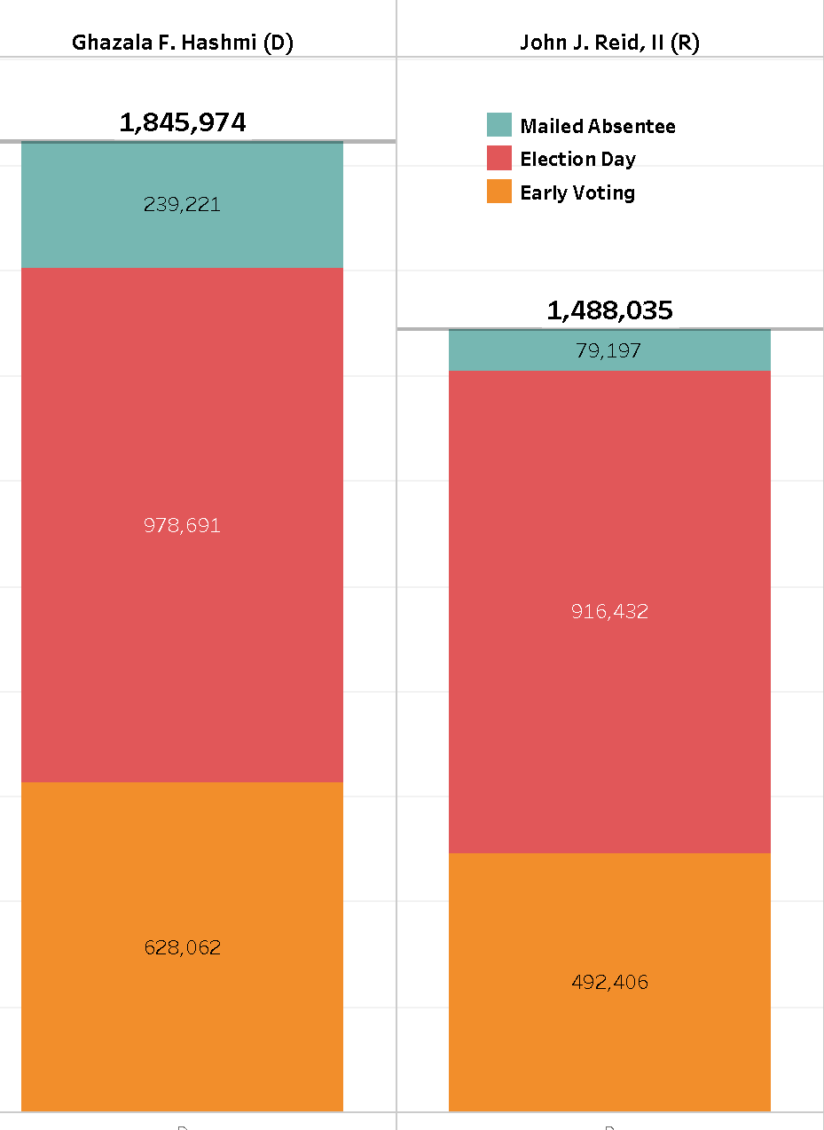 In the Lt. Gov. race between Democrat Ghazala Hashmi and Republican John Reid, the percentage differences tell the story as well: