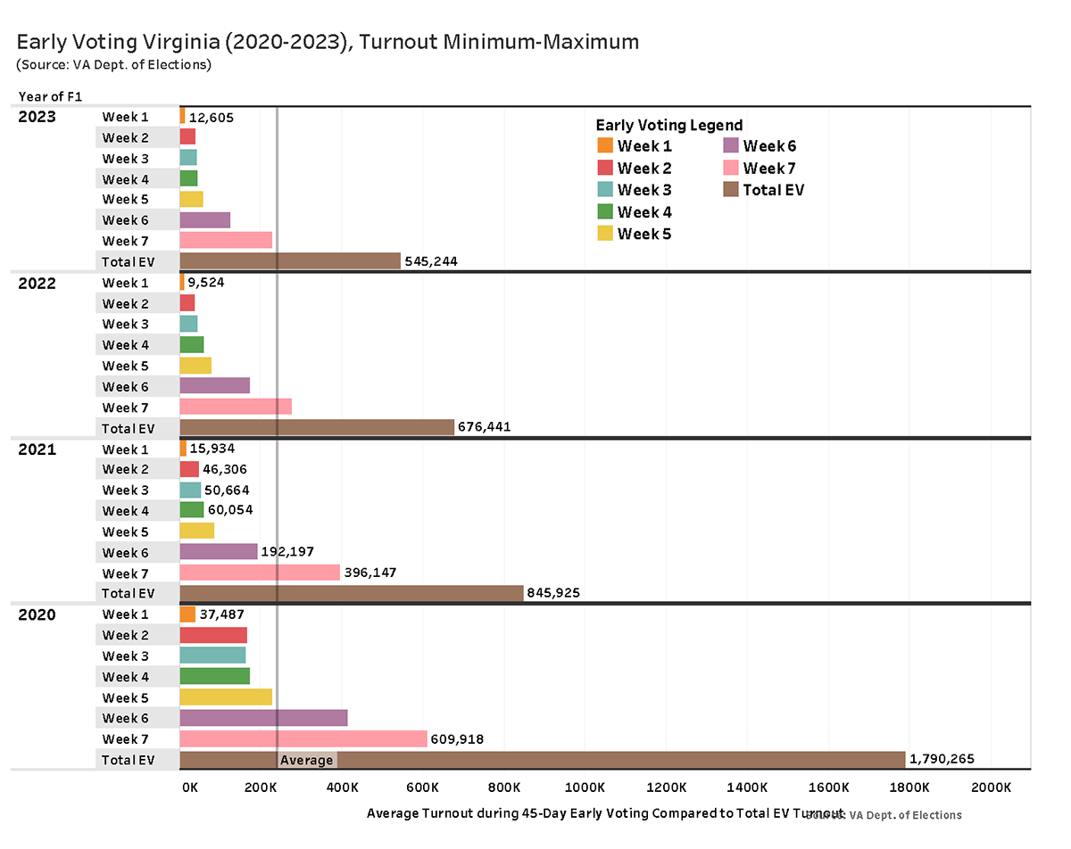 Chart compares early voting turnout in Virginia in 2020, 2021, 2022, and 2023.