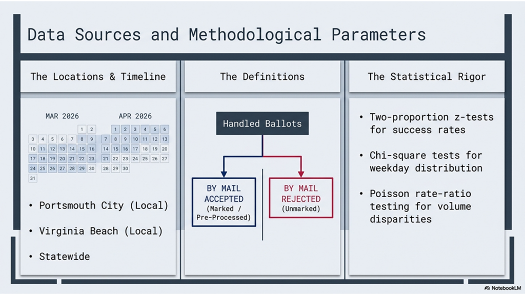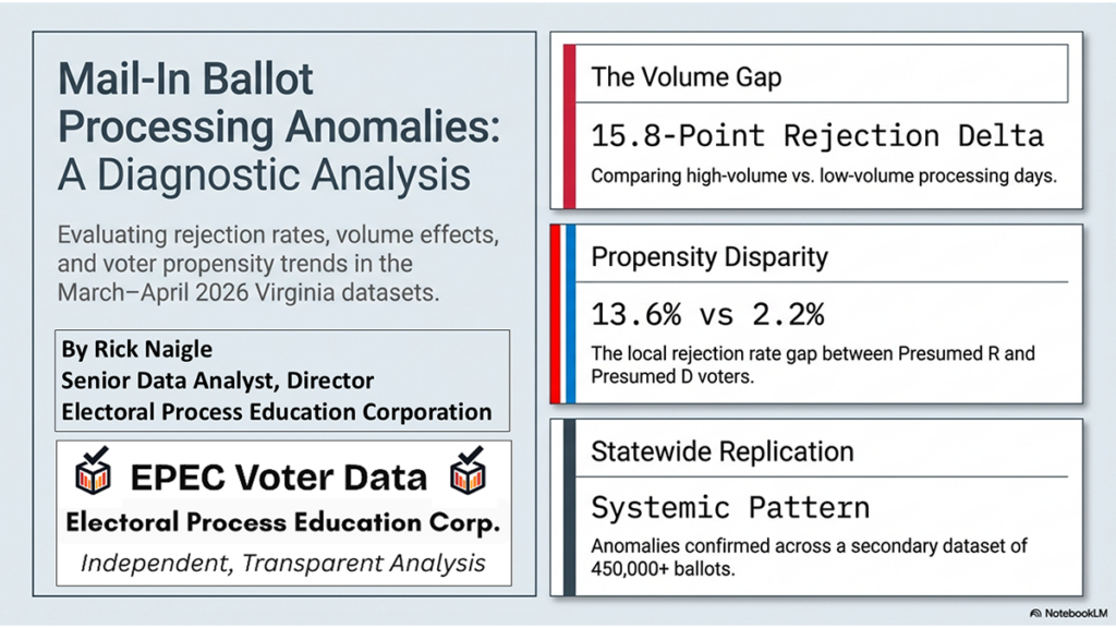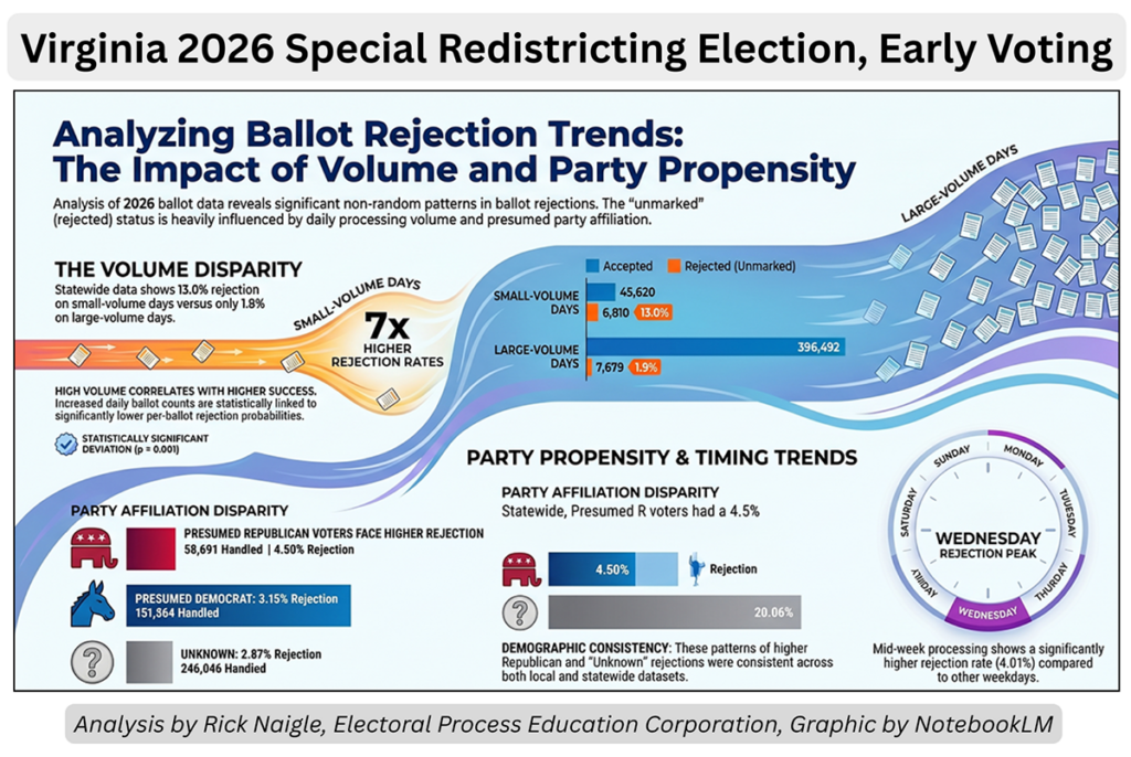 Using Daily Absentee List (DAL) of unofficial voting data from Virginia’s Dept. of Elections, and ChatGPT-5 Mini to help compute statistical analysis, Naigle reviewed acceptance (“Marked” & “Pre-Processed”) and rejection (“Unmarked”) rates on mail-in ballots over a 25-day period.