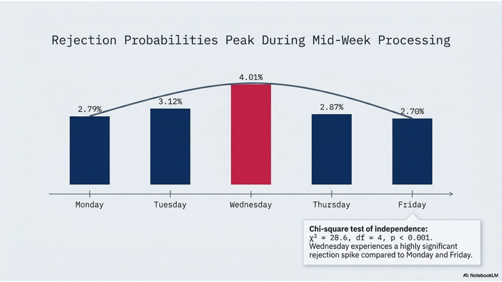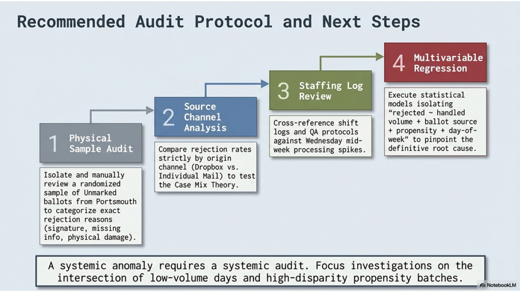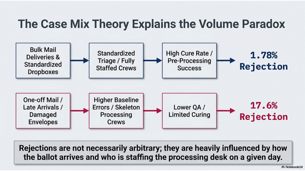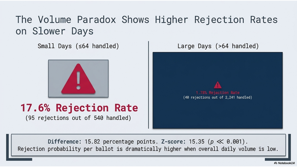 “The overall ballot rejection rate is higher on days where the total number of ballots received is lowest. That is statistically significant — which means there is some kind of ‘special cause’ for this finding. It is not random.”
