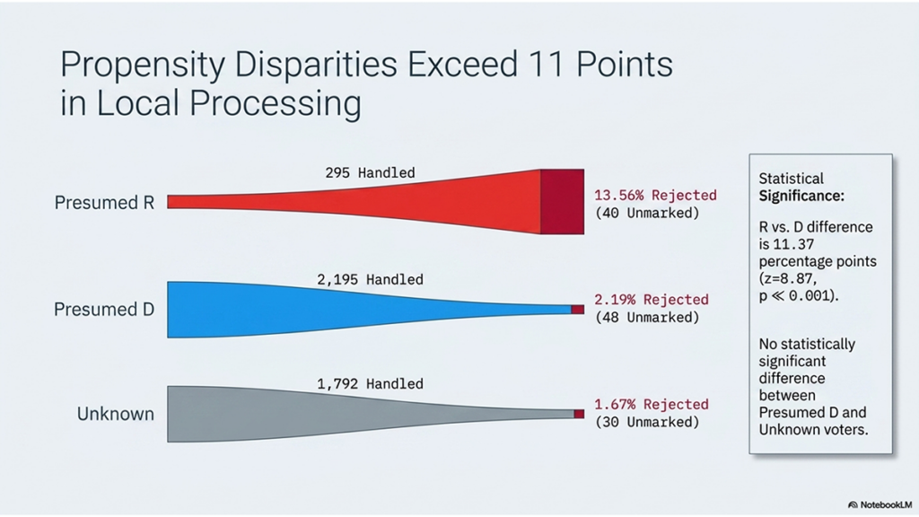 “Presumed R voters have a substantially higher probability their ballots are recorded as Unmarked (rejected) (~13.6%) than Presumed D (~2.2%) or Unknown (~1.7%); differences R vs D and R vs Unknown are highly significant (p << 0.001).”
