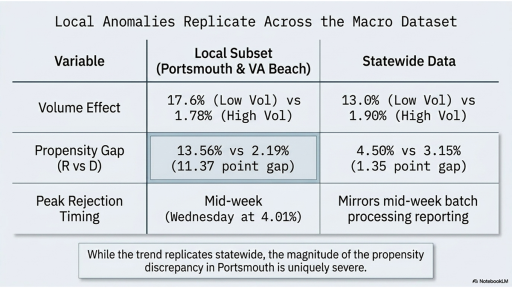 - He looked at Portsmouth and Virginia Beach City localities’ mail-in ballot data, and analyzed statewide volumes.