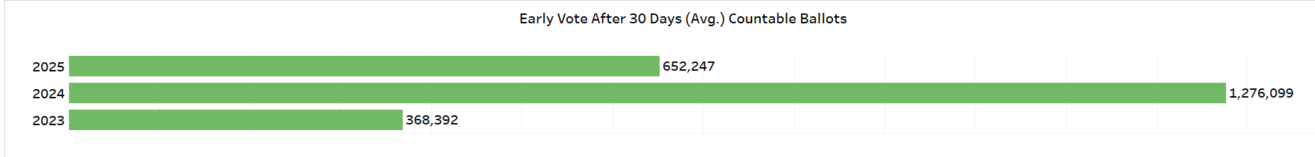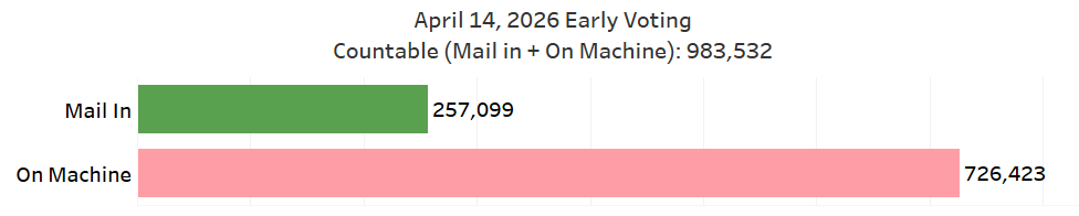 Just over 1.08 million ballots are in issued (“still out”) or countable (“mail-ins” + “on machine”) status, close to 1/3rd of the 3.4 million ballots cast in the entire 2025 gubernatorial election.