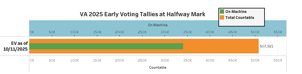 As of Friday, the 2025 early voting tally for House races stood at 340,304 on-machine ballots cast so far, 167,608 mail-in ballots, for 507,921 countable ballots for all 100 House of Delegate races. We are preparing a deeper dive of the House races.
