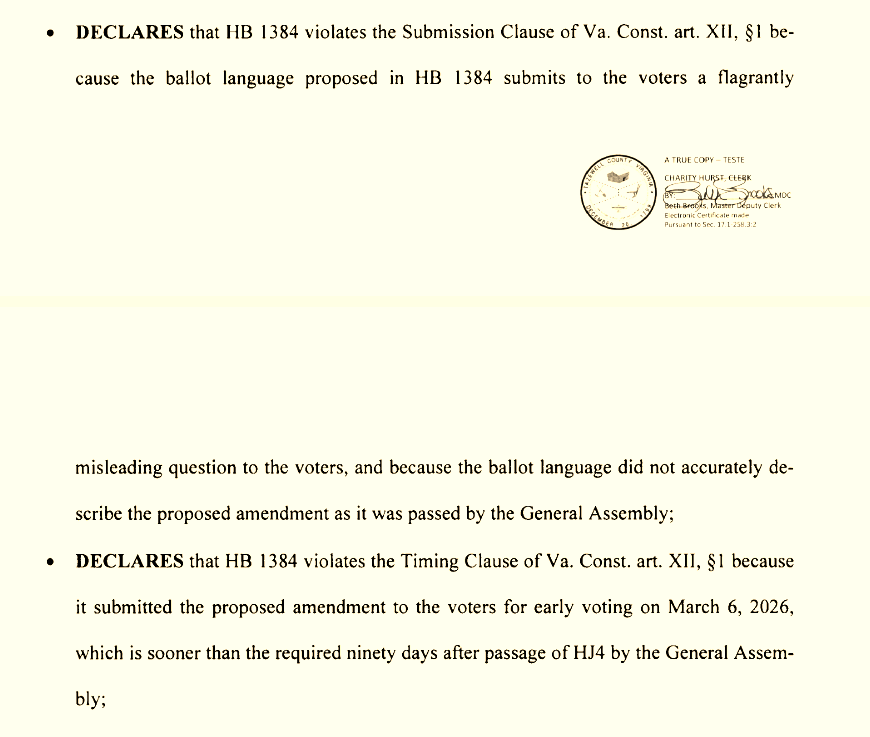 Virginia’s Board of Elections is enjoined from certifying the April 21 Special Election votes by the Friday deadline — per Tuesday’s order by the Supreme Court of VA.